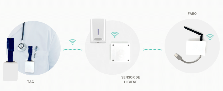 Detecta cuando el usuario realiza la higiene de manos, activa las retroalimentaciones de luz en TAG y envía datos a la nube. Autonomía hasta por 6 meses